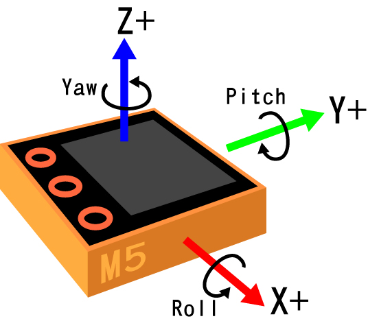 MPU6886はM5GO Bottom2側にあり、軸の向きが分からず動かしながら調べた結果がこれ、よく分かっていないので間違っているかも。